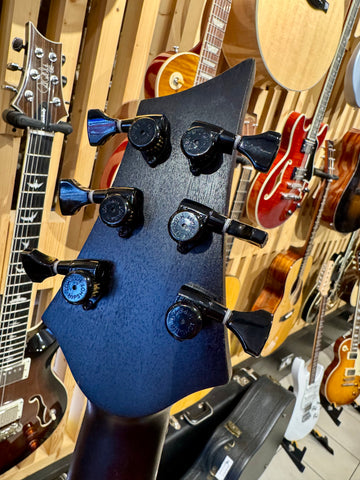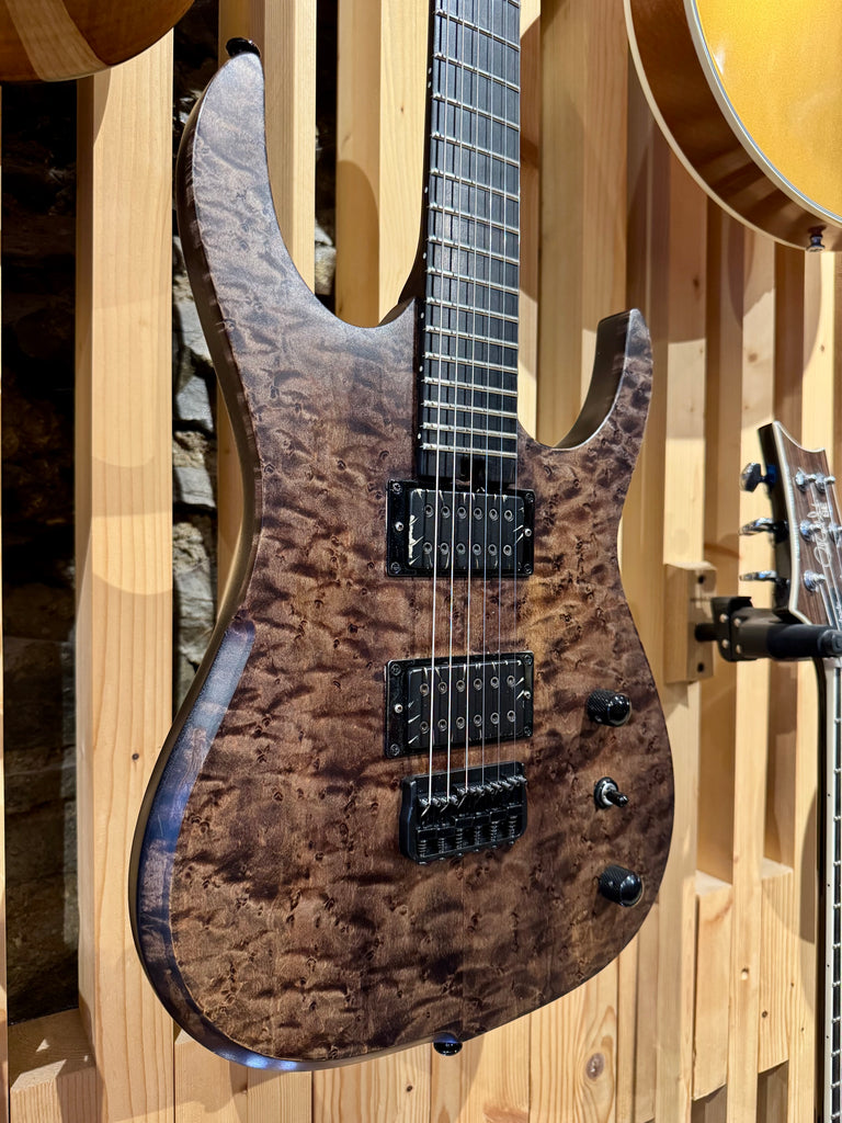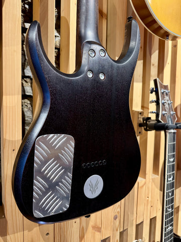 This is a very cool custom Tantalum from Hufschmid Guitars Switzerland. Featuring a one piece quartersawn Sapele Mahogany Body. Hard Rock Birdseye Maple Top. One piece rift sawn Mahogany neck, West African Ebony fretboard, Stainless Steel frets, Bareknuckle Aftermath Pickups, Hipshot Bridge and Hipshot Locking Tuners, 6 way toggle switch.